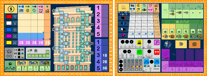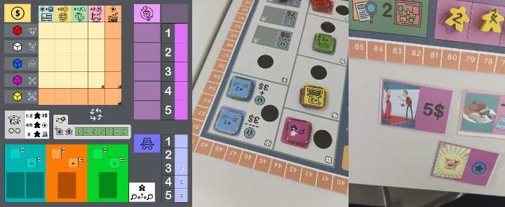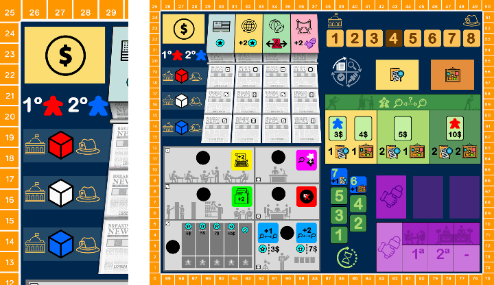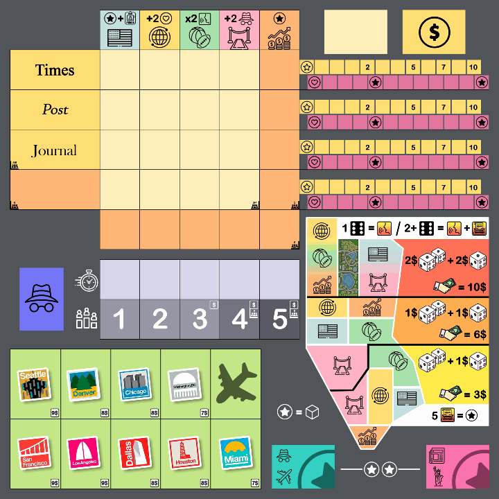 En un principio, mi idea era que los jugadores fueran periodistas freelance y que los meeples numerados representaran las acciones que realizaban y la “fuerza” con la que lo hacían, pudiéndote imponer al resto. Podías publicar noticias en varios periódicos, contactar con filtradores, viajar por Estados Unidos investigando (de una manera muy rudimentaria) o alternar por los distintos locales y eventos de Manhattan para conseguir, con un poquito de suerte, exclusivas para publicar en turnos siguientes.