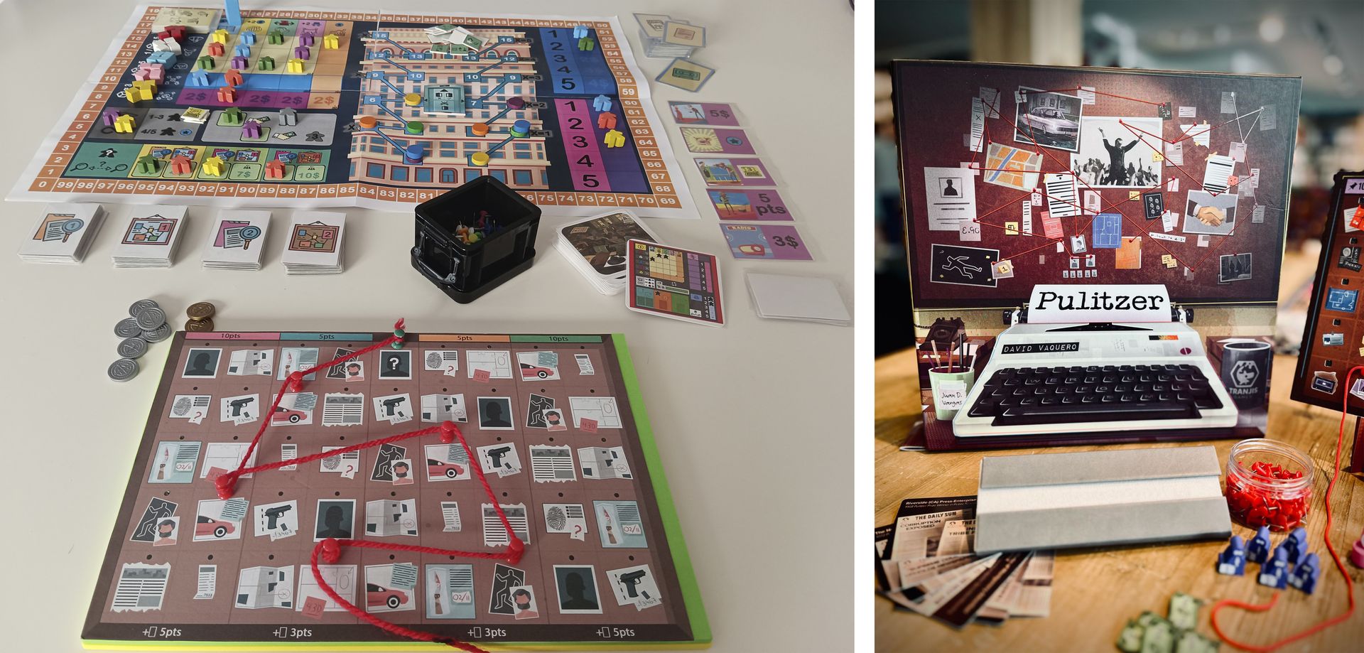 Pero algo no terminaba de encajar, así que decidí investigar y documentarme. Repasando la lista de ganadores del premio Pulitzer me di cuenta de que, en numerosas ocasiones, los premios se entregaban de manera coral a un equipo o la redacción de un medio, no solo a periodistas individuales. Llegué a la conclusión de que era mejor para el juego que los jugadores manejaran una redacción de investigación de un periódico y que los meeples numerados representaran miembros de la misma con distinta experiencia periodística, desde el becario al periodista curtido en la profesión y que se las sabe todas.