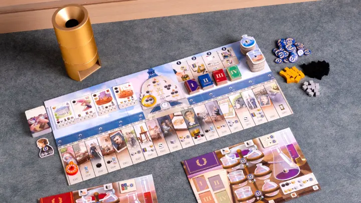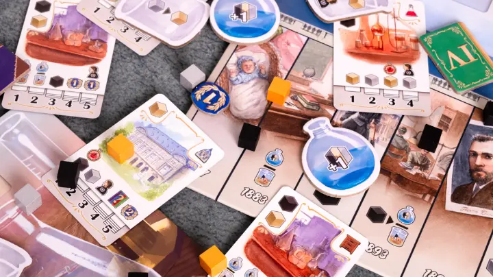 Uno de los elementos más interesantes del juego es su tablero central, que representa una línea temporal inspirada en la vida de Marie Skłodowska. A medida que las personas jugadoras avanzan por ella, el juego progresa hacia su final.